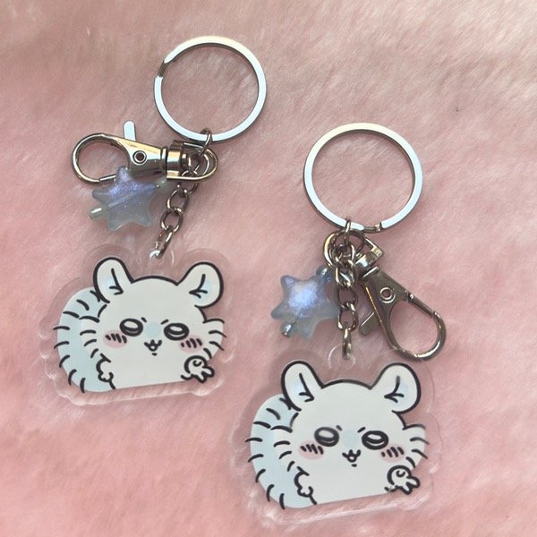 Llavero con dije de acrílico, mosquetón y mostacillas. Largo total del llavero 10cm.